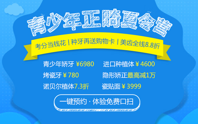 活动期间美齿全线8.8折,凡是现在通过网络预约的顾客都可享受超值矫牙福利及考分当钱花抵减特价等优惠,看牙矫牙尊享折上折,您可以直接在线预约或者拨打我们的热线电话0755-82339968报名咨询。